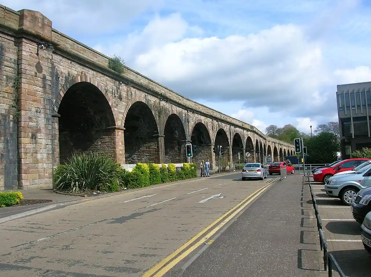Kilmarnock railway viaduct, known locally as The Viaduct, is a railway viaduct crossing the town centre of Kilmarnock, and was constructed between 1843 and 1850. The bridge begins at Kilmarnock railway station and leads to destinations in England. It is a most distinctive feature of the town centre with 23 masonry arches and defines the northern boundary of the town centre. It was built in the 1840s to enable the Glasgow–Kilmarnock line to continue to Carlisle. Read more on Wikipedia