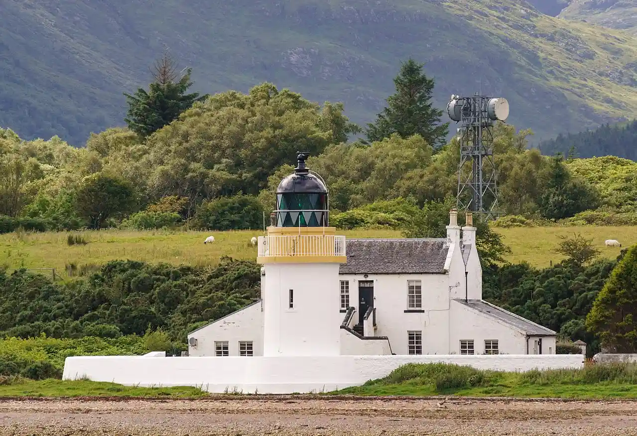 Corran Point Lighthouse is an active lighthouse located at Corran Point on the west side of the Narrows of Loch Linnhe, in Lochaber, Highland, Scotland. It was built in 1860 as a project by Thomas Stevenson and David Stevenson; it is a masonry tower with gallery, lantern and keeper's house which has become private property. The lighthouse emits an isophase light white, red or green according to the directions and was the first lighthouse to be automated in 1898. Read more on Wikipedia