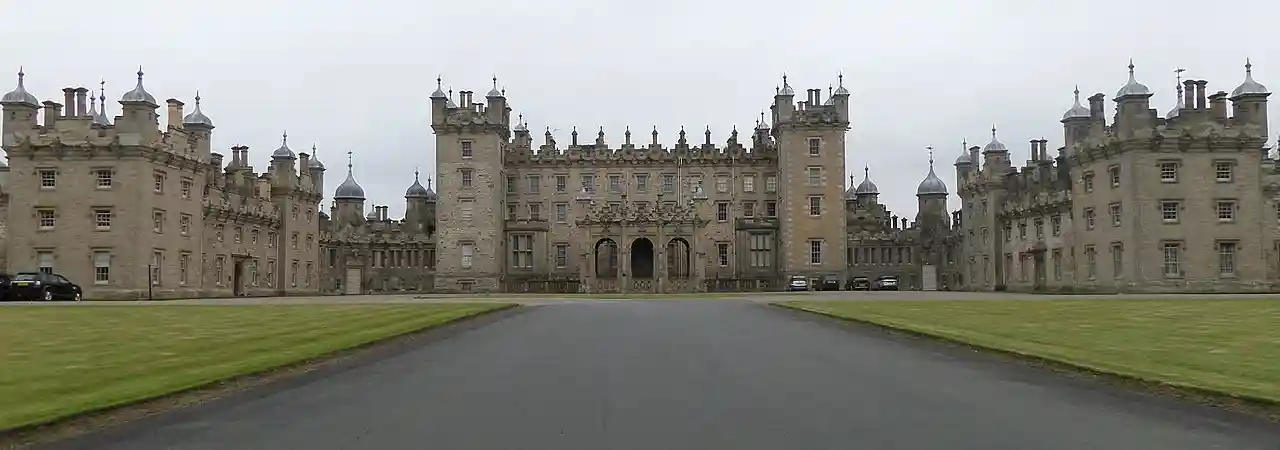 Floors Castle, in Roxburghshire, south-east Scotland, is the seat of the Duke of Roxburghe. Despite its name it is an estate house rather than a fortress. It was built in the 1720s by the architect William Adam for Duke John, possibly incorporating an earlier tower house. In the 19th century it was embellished with turrets and battlements, designed by William Playfair, for The 6th Duke of Roxburghe. Floors has the common 18th-century layout of a main block with two symmetrical service wings. Floors Castle stands by the bank of the River Tweed and overlooks the Cheviot Hills to the south. Read more on Wikipedia