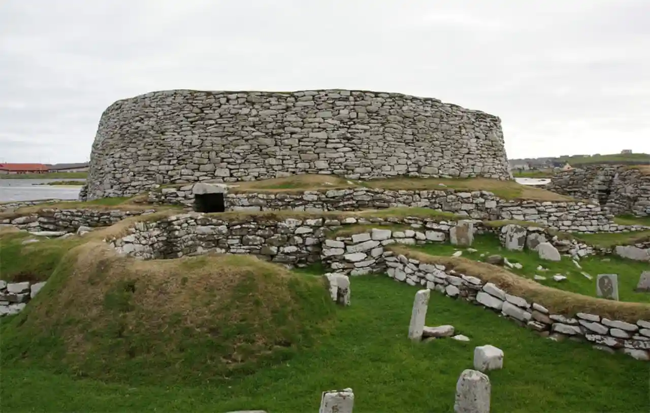 The Broch of Clickimin (also Clickimin or Clickhimin Broch) is a large, well-preserved but restored broch in Lerwick, Shetland, Scotland (). Originally built on an island in Clickimin Loch, it was approached by a stone causeway. The broch is situated within a walled enclosure and, unusually for brochs, features a large "forework" or "blockhouse" between the opening in the enclosure and the broch itself. The site is maintained by Historic Scotland. According to its excavator, John R.C. Hamilton, there were several periods of occupation of the site: Late Bronze Age farmstead, Early Iron Age farmstead, Iron Age fort, broch period, and wheelhouse settlement. Read more on Wikipedia