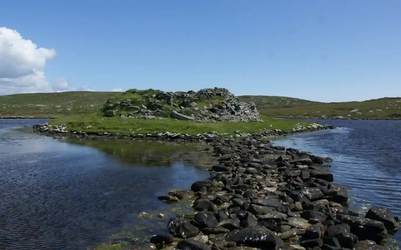 Dun an Sticir ( ) is an Iron Age broch situated approximately 9.5 kilometers north of Lochmaddy in a loch on North Uist in the Scottish Outer Hebrides. A building was erected on the site in the late medieval period. Read more on Wikipedia