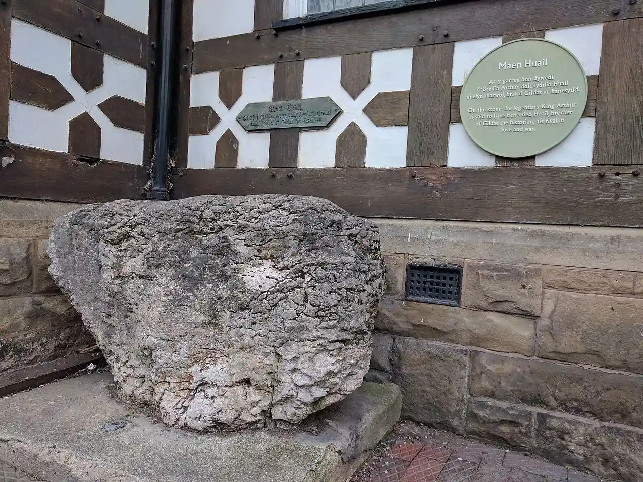 Maen Huail is a stone block at St Peter's Square, in the centre of Ruthin, Denbighshire, North Wales. A circular plaque next to it states "Maen Huail on which tradition states, King Arthur beheaded Huail, brother of Gildas the historian". The stone was recorded in 1699 as being in the middle of the road, and now stands on a concrete plinth against the half-timbered wall of the Barclays Bank building, a 20th-century copy of the now mainly destroyed Exmewe Hall.. Cadw SAM: DE030: Maen Huail Historic Stone Read more on Wikipedia