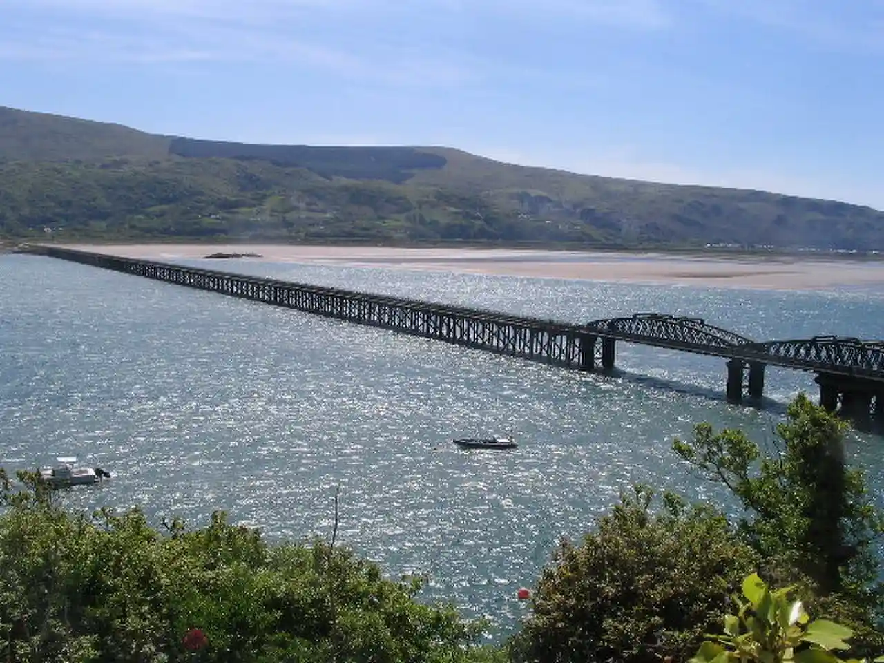 Barmouth Bridge (Welsh: Pont Abermaw), or Barmouth Viaduct is a Grade II* listed single-track wooden railway viaduct across the estuary of the River Mawddach near Barmouth, Wales. It is long and carries the Cambrian Line. It is the longest timber viaduct in Wales and one of the oldest in regular use in Britain. Read more on Wikipedia