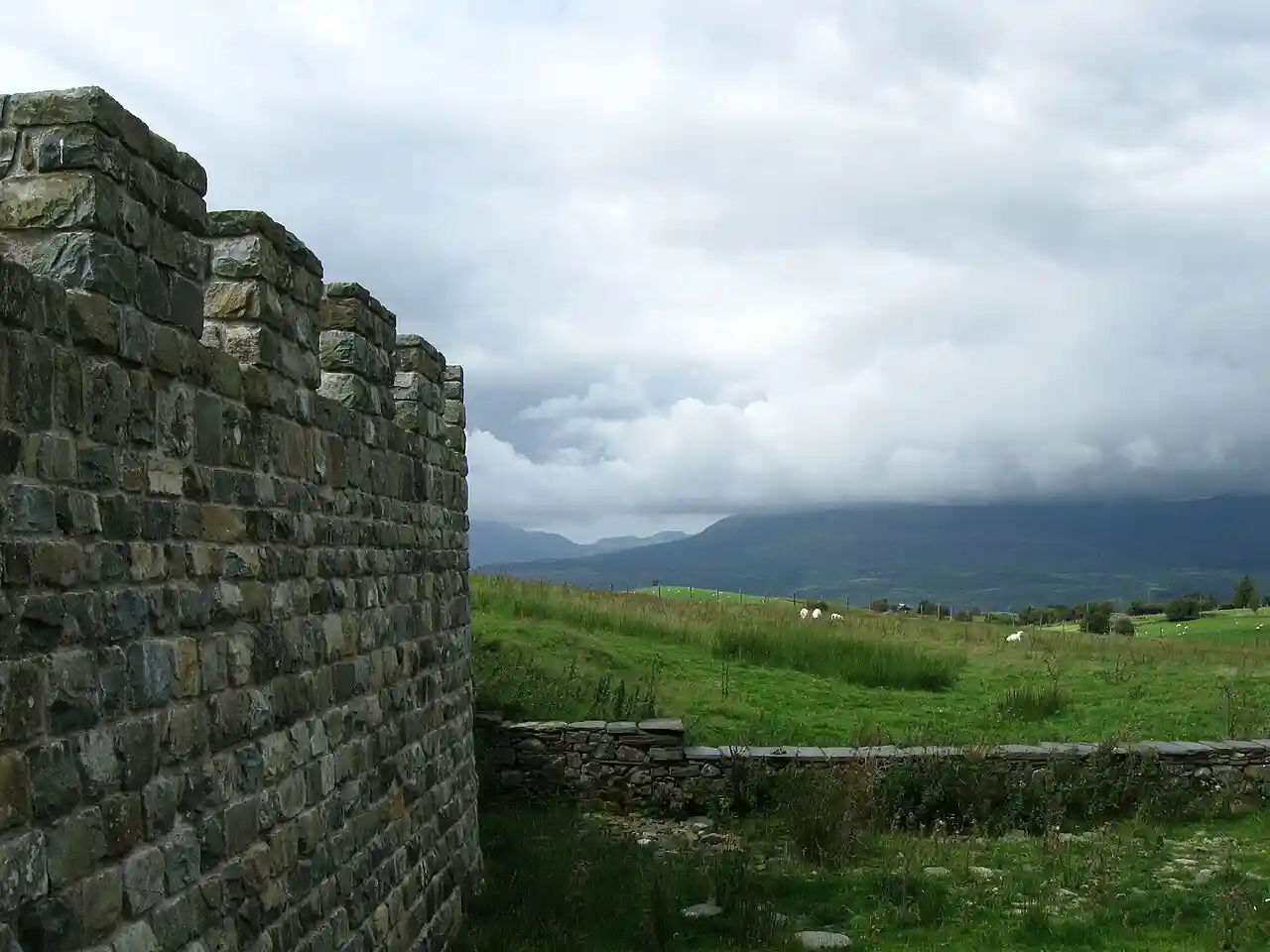 Tomen y Mur is a First Century AD Roman fort in Snowdonia, Gwynedd, Wales. The fortification, which lies on the slope of an isolated spur northeast of Llyn Trawsfynydd, was constructed during the North Wales campaigns of governor Gnaeus Julius Agricola in AD 78. The fort stood adjacent to the Roman road known as Sarn Helen. It was occupied until it was abandoned around AD 140. In the 11th century, the Normans reused part of the site for a motte. Read more on Wikipedia
