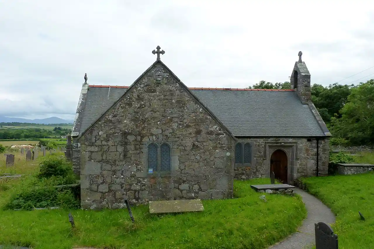 St Peter's Church, Llanbedrgoch, is a small medieval parish church near the village of Llanbedrgoch in Anglesey, north Wales. The oldest parts of the building date from the 15th century; it was extended in the 17th century and restored twice in the 19th century. The doorway is decorated with carvings of two human heads, one wearing a mitre. The church contains a reading desk made from 15th-century bench ends, one carved with a mermaid holding a mirror and comb. Read more on Wikipedia