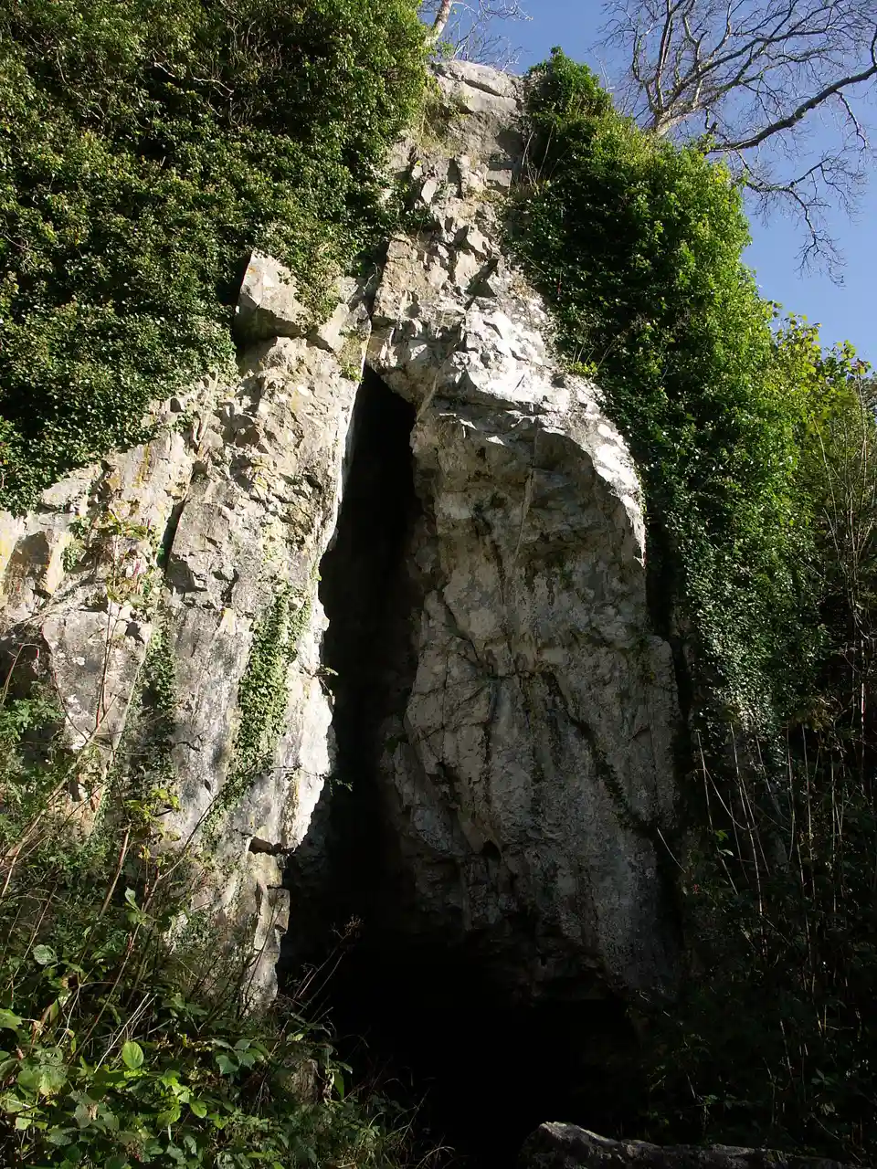 Cathole Cave, Cat Hole Cave or Cathole Rock Cave, is a cave near Parc Cwm long cairn at Parc le Breos, on the Gower Peninsula, Wales. It is a steep limestone outcrop, about north of the cromlech along the Parc le Breos Cwm valley and near the top of the gorge, about from the valley floor. The cave is a deep triangular fissure penetrating the hillside and narrowing towards the top. It has two entrances, with a natural platform outside the larger of the two. It is about seven miles (12 km) west south–west of Swansea, Wales, in what is now known as Coed y Parc Cwm at Parc le Breos, on the Gower Peninsula. Read more on Wikipedia