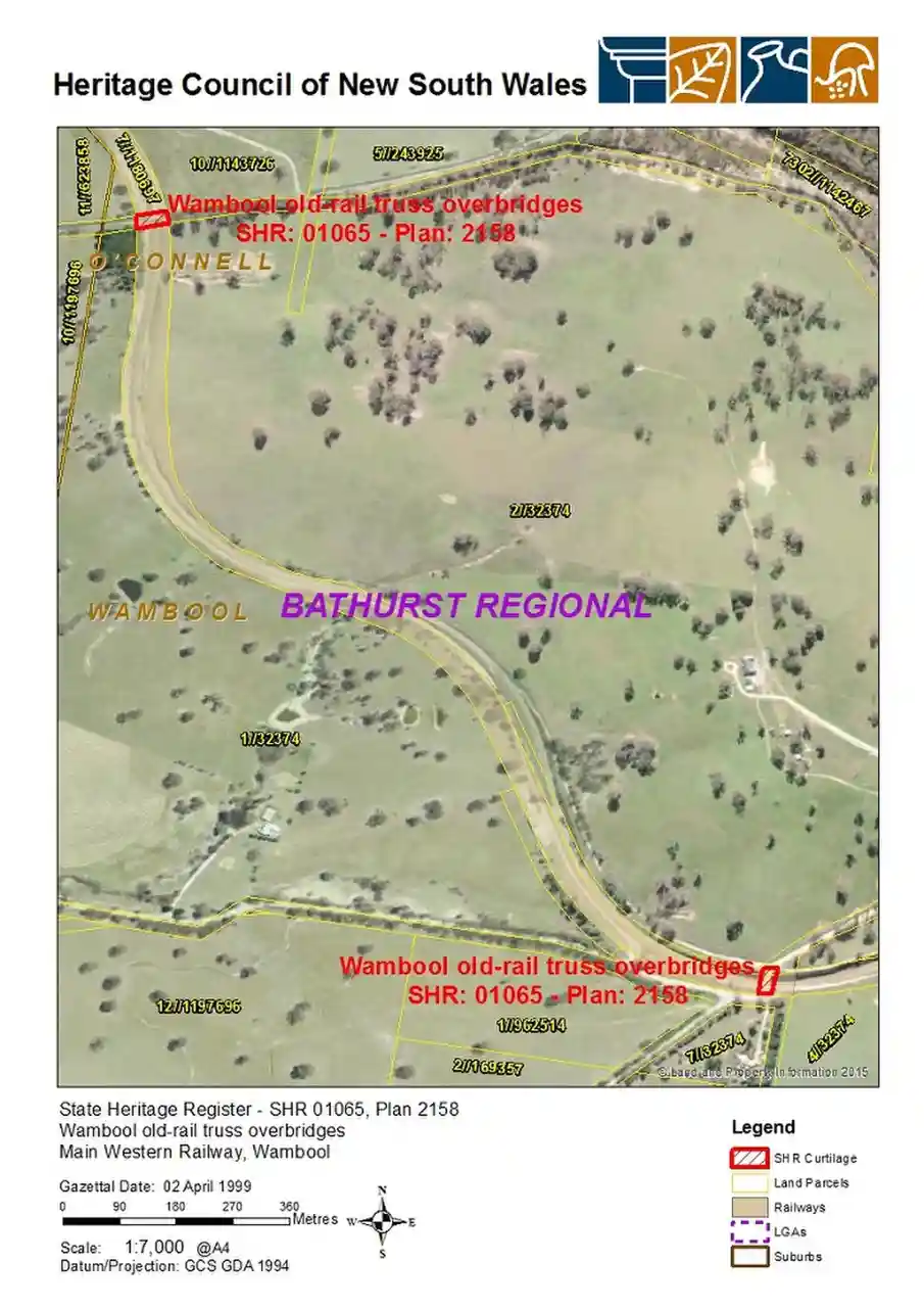 The Wambool old-rail truss overbridges are two heritage-listed railway bridges on the Main Western line in Wambool, Bathurst Region, New South Wales, Australia. It was built in 1896. The property is owned by Transport Asset Holding Entity, an agency of the Government of New South Wales. It was added to the New South Wales State Heritage Register on 2 April 1999. Read more on Wikipedia