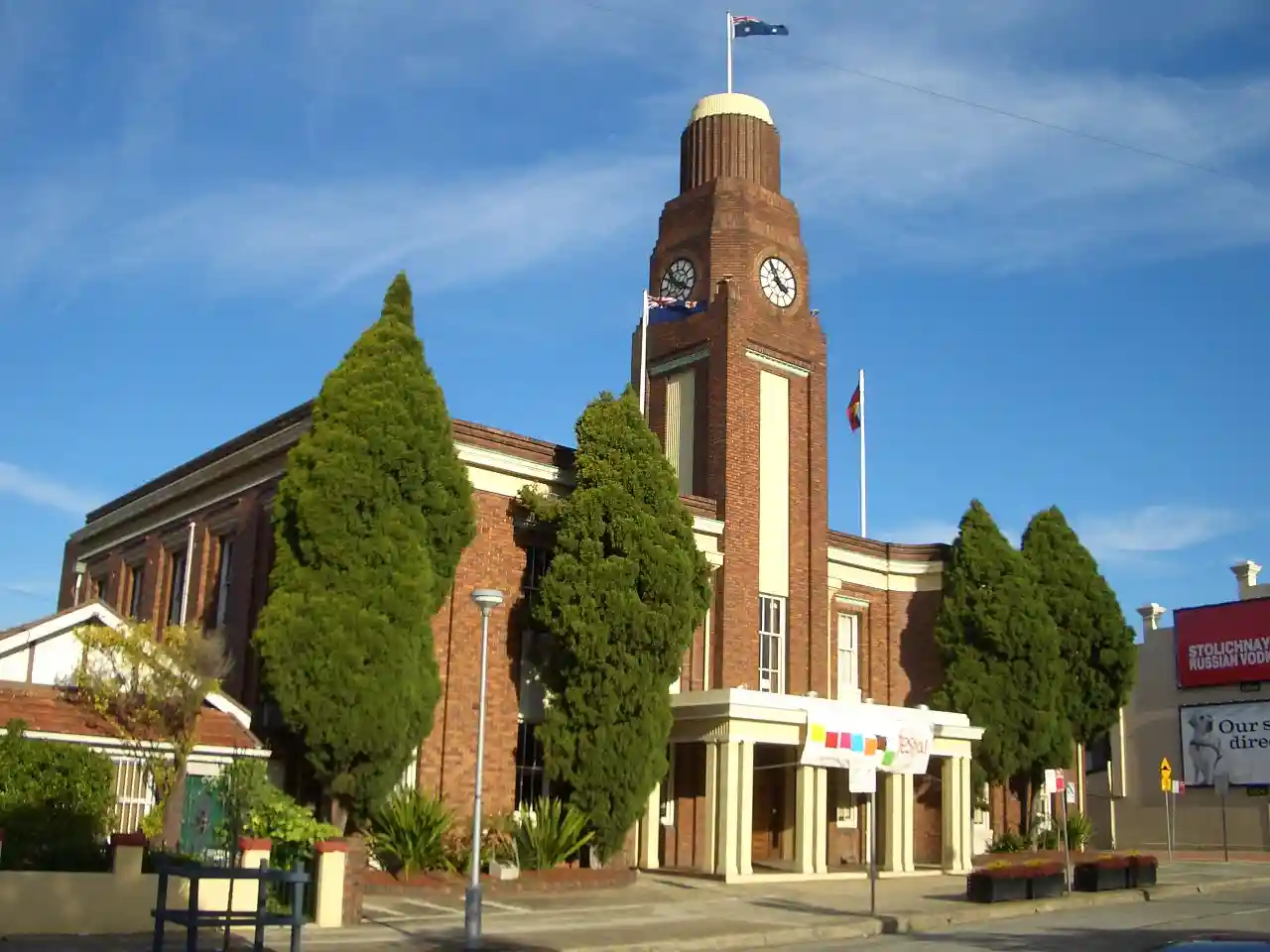 The Petersham Town Hall is a heritage-listed town hall located at 107 Crystal Street in Petersham, a suburb in the Inner West of Sydney, Australia. It was built in 1937–38 in the Inter-War Stripped Classical architectural style by architects Rudder & Grout, and replaced the first Petersham Town Hall on the site, which was designed in the Victorian Renaissance Revival style by Thomas Rowe in 1880–1882. The Town Hall was the seat of Petersham Municipal Council from 1938 to 1948 and from 1948 to 1974 was the seat of the Municipality of Marrickville, which absorbed Petersham. When the council moved to new offices across the street in 1974, the town hall has primarily been used as a meeting hall, community centre, filming location and archival office. Read more on Wikipedia