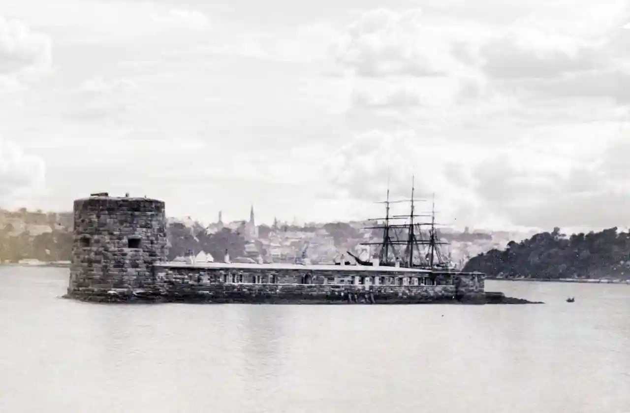 Fort Denison, part of the Sydney Harbour National Park, is a protected national park that is a heritage-listed former penal site and defensive facility occupying a small island located north-east of the Royal Botanic Garden and approximately east of the Opera House in Sydney Harbour, New South Wales, Australia. The island is also known as Mattewanye or Muddawahnyuh in the Eora language, and as Pinchgut Island. Read more on Wikipedia