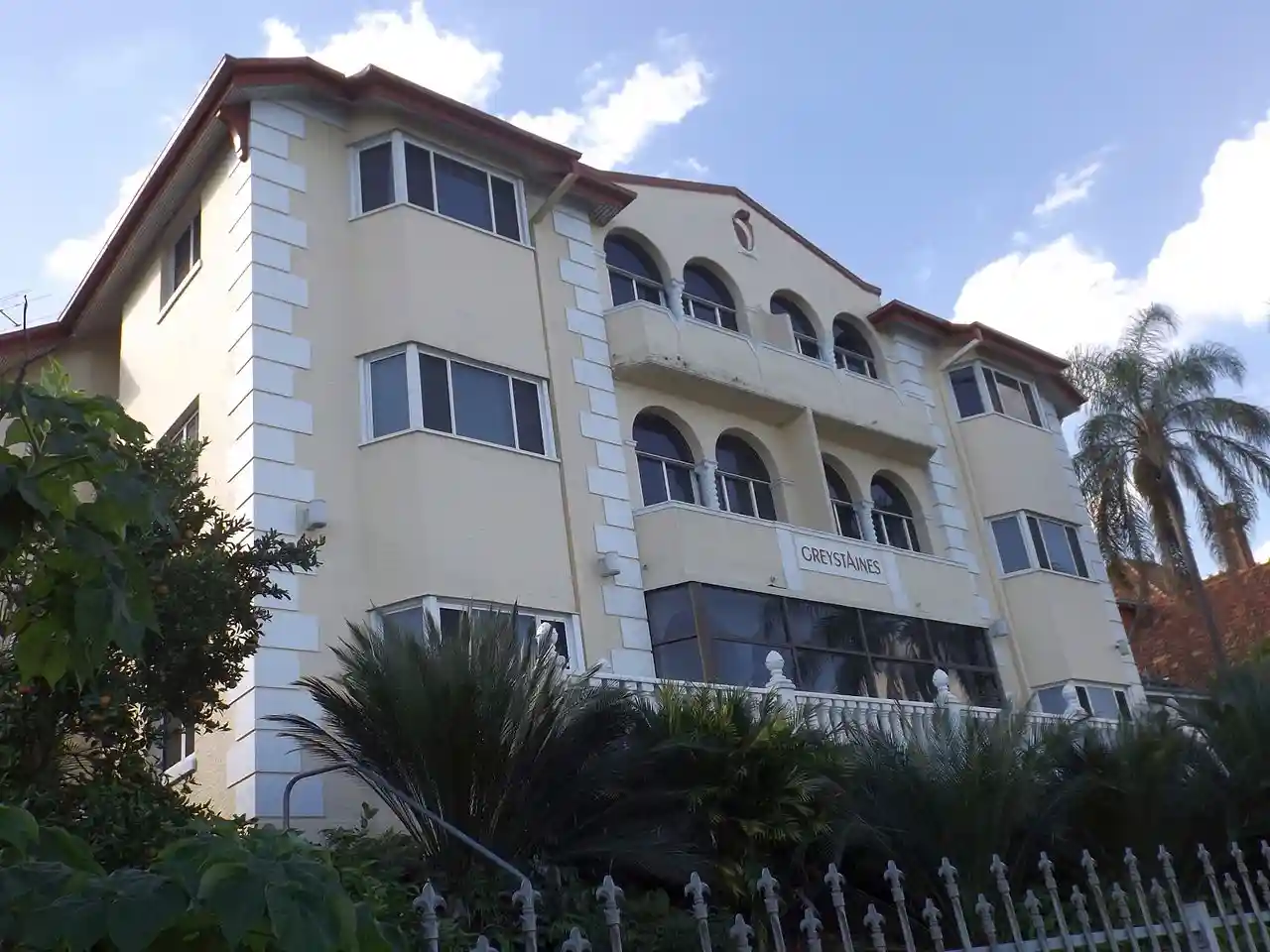 Greystaines is a heritage-listed 8 bedroom, 6 bathroom, 3 kitchen house with 6 car garage (previously an apartment block) at 240 Kingsford Smith Drive, Hamilton, City of Brisbane, Queensland, Australia. A substantial, three-storeyed building, it was designed by George Rae, a Brisbane-based architect who designed some of Brisbane's best interwar buildings, and built from 1934 onwards by Douglas Francis Roberts for Mr Sydney James Dove and his wife Audree Thomasina Dove. It was also known as Greystaines Flats. It was added to the Queensland Heritage Register on 26 May 2006. Read more on Wikipedia