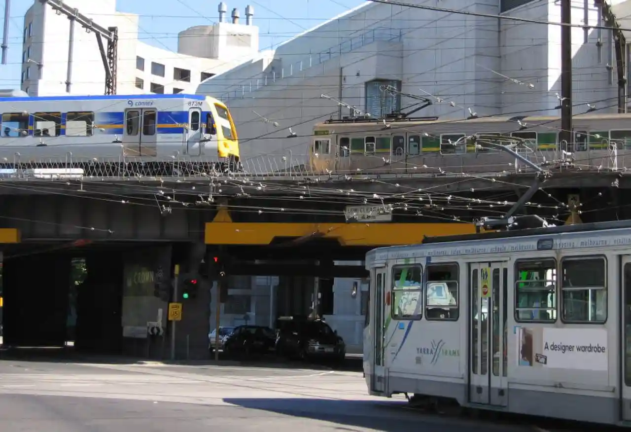 The Flinders Street Viaduct is a railway bridge in Melbourne, Australia. Made up of six tracks built at different times, it links Flinders Street station to Southern Cross station, forming the main connection between the eastern and western parts of the Victorian rail network. Read more on Wikipedia