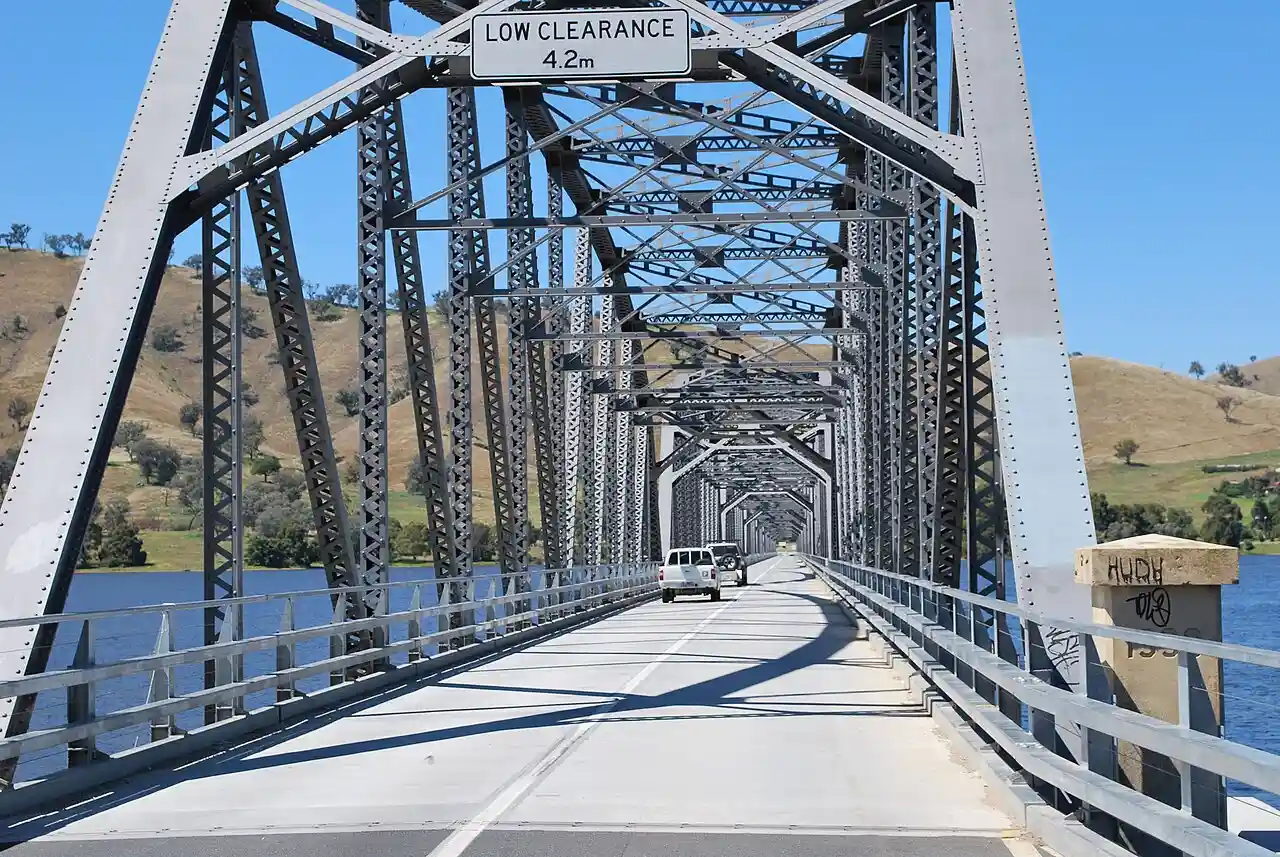 The Bethanga Bridge is a steel truss road bridge that carries the Riverina Highway across Lake Hume, an artificial lake on the Murray River in Australia. The dual heritage-listed bridge crosses the border between the Australian states of New South Wales and Victoria, linking the Victorian towns of Bellbridge and Bethanga with the regional New South Wales city of Albury. Read more on Wikipedia