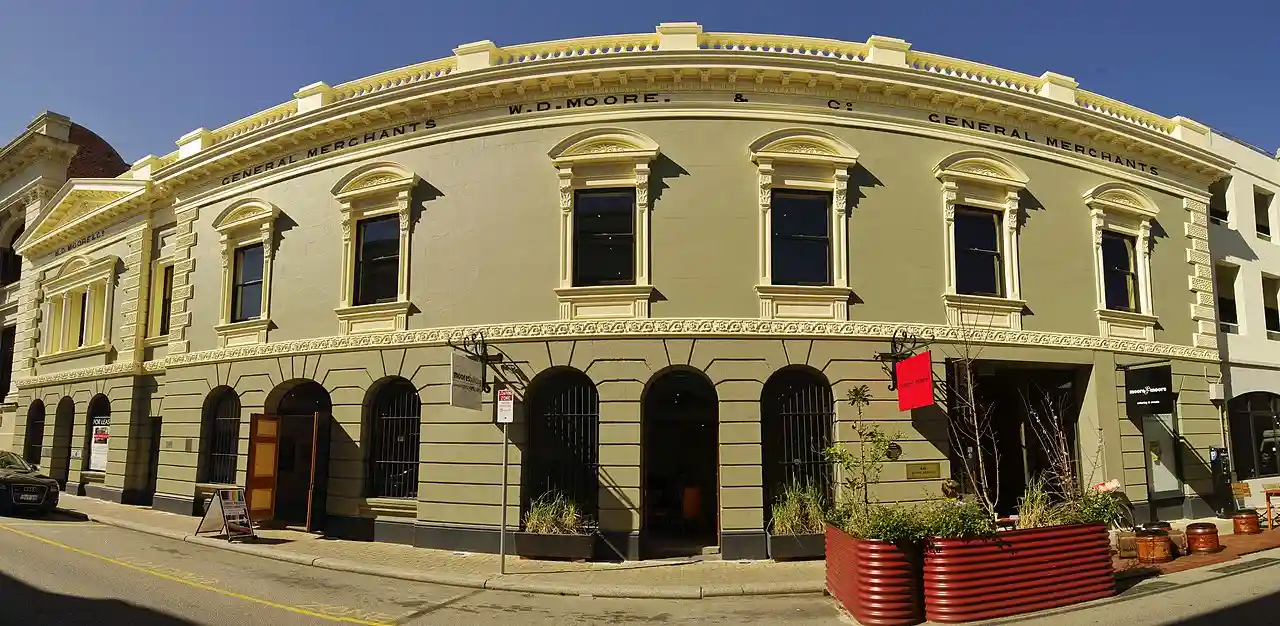 WD Moore & Co Warehouse complex is on Henry Street, Fremantle. It was unified in 1899 behind an ornamental stucco facade. A store was established on the site by Samuel Moore in the 1840s. William Dalgety Moore later established a general merchant business there in 1862. The complex comprises a residence, warehouse, factory stable, offices and shop, built between 1862 and 1899, in addition to a three-storey backstore which was built at an unknown date, possibly as early as 1844. The complex was listed on the Register of the National Estate in 1978. Read more on Wikipedia