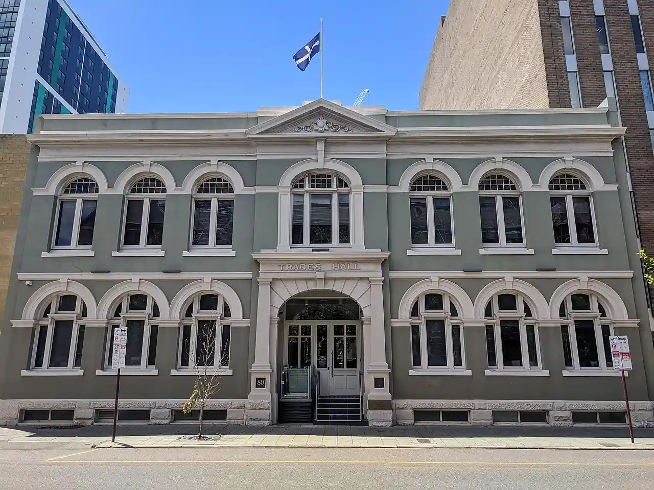 The Perth Trades Hall is a historic trades hall building in Perth, Western Australia that has been occupied by various organisations of the Western Australian trade union movement. The building is now the WA headquarters of the Construction, Forestry, Maritime, Mining and Energy Union (CFMEU). Read more on Wikipedia