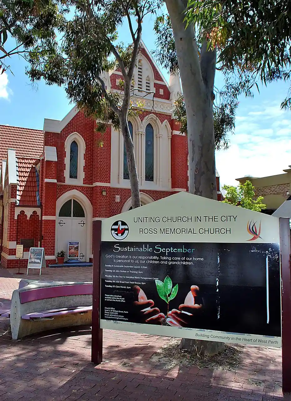 The Ross Memorial Church is a Uniting church on Hay Street in West Perth, Western Australia, Australia. Established as a Presbyterian church in 1917, the church is home of the Wesley worshipping community of the Uniting Church in the City. Read more on Wikipedia
