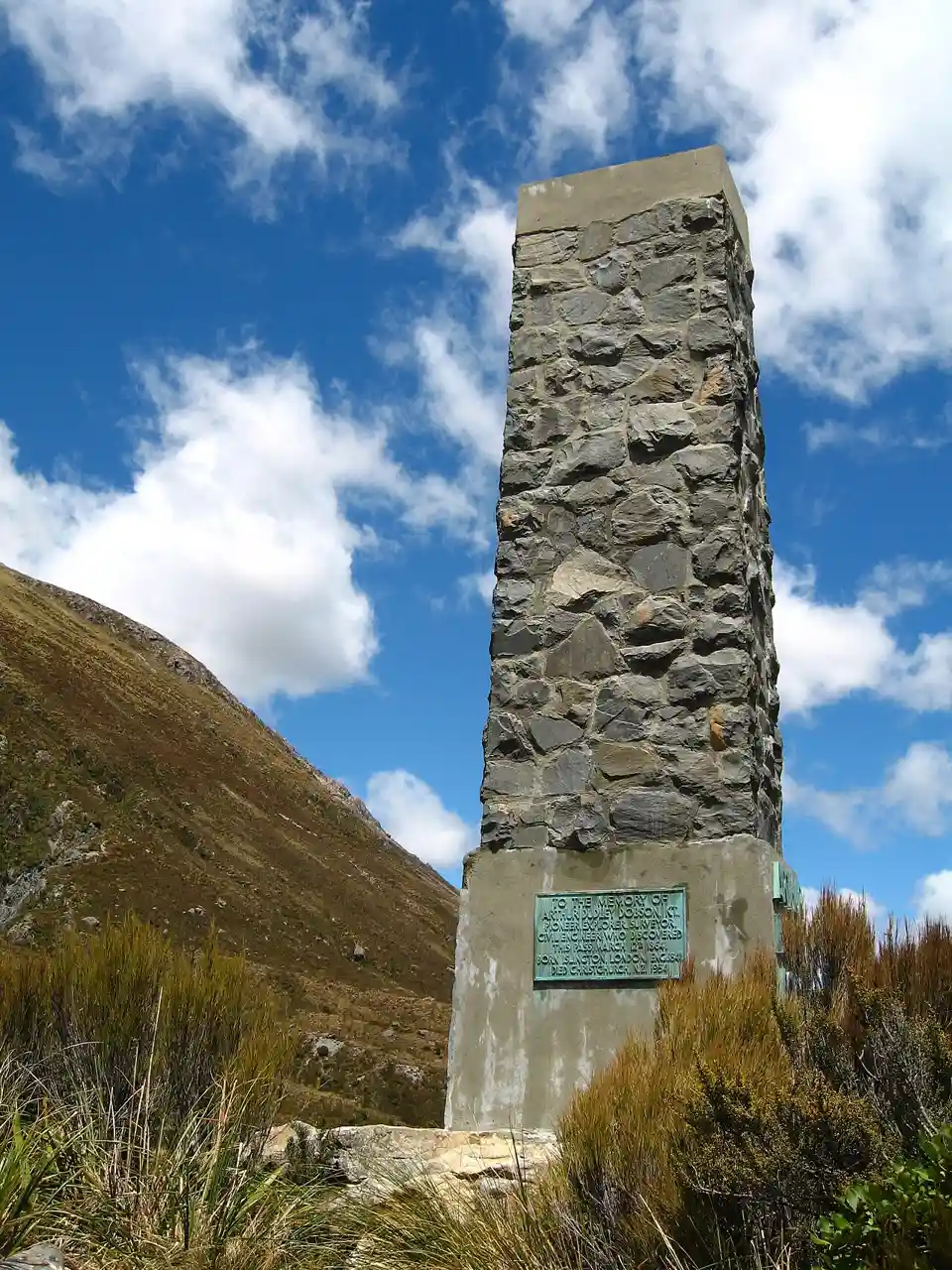 The Arthur Dudley Dobson Memorial is a memorial obelisk at Arthur's Pass in New Zealand's Southern Alps. Unveiled in 1937 by former Prime Minister George Forbes, it commemorates Sir Arthur Dudley Dobson (1841–1934), after whom the pass is named. Read more on Wikipedia