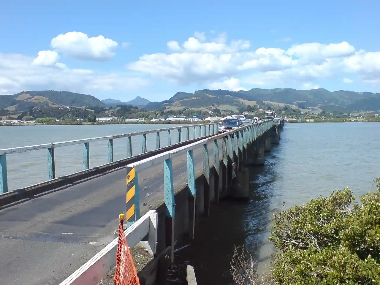 The Historic Kopu Bridge (originally Hauraki Bridge and sometimes Waihou River Bridge) is a single-lane swing bridge that spans the Waihou River, near its emergence into the Firth of Thames in the Thames-Coromandel District of New Zealand's North Island. The bridge was completed in 1928 and was part of State Highway 25. The swinging span in the middle of the bridge is 43 metres long and with an overall length of 463 metres, the bridge was the longest and oldest single lane bridge within the state highway network. It is also New Zealand's only remaining operational swing bridge. Read more on Wikipedia