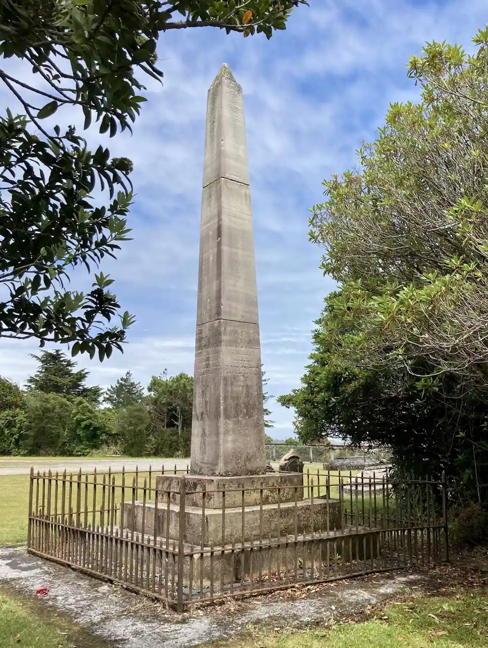 The Westland Explorers' Monument, also known as the Explorers' Monument, is an obelisk in Hokitika, New Zealand. It commemorates four men who lost their lives on the West Coast of the South Island between 1863 and 1866. The impetus for its erection in 1868 was the 1866 murder of George Dobson, and early on the monument was referred to as the Dobson Memorial. It was then referred to as the Weld Street Monument in reference to its original location in the centre of the intersection of Weld and Sewell streets. Deemed a traffic impediment, it was shifted to Hokitika Cemetery in 1880, but an even larger structure, the Hokitika Clock Tower, was put in its place at this intersection in 1902/1903. Read more on Wikipedia